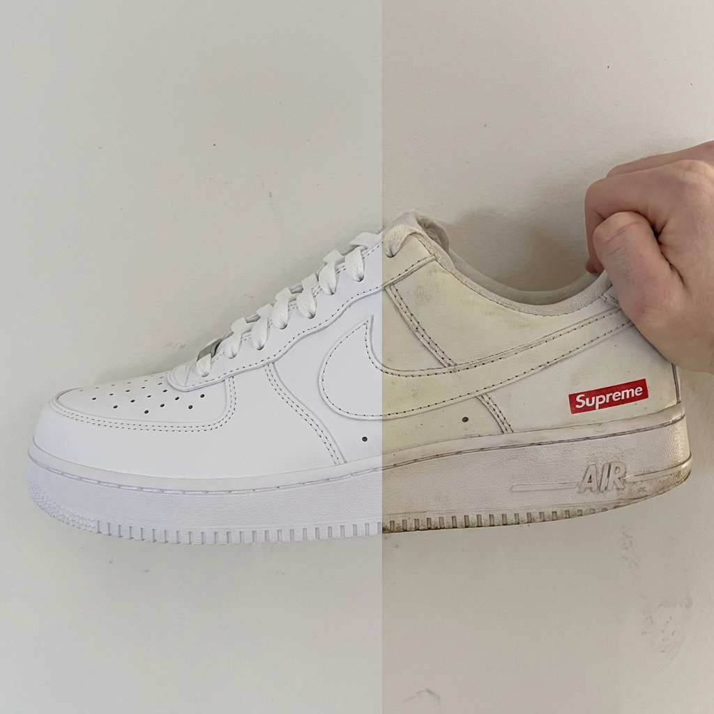 Matowa biel, widoczne zabrudzenia, drobne rysy i ślady codziennego użytkowania. But wygląda na zużyty i traci swój pierwotny charakter.
